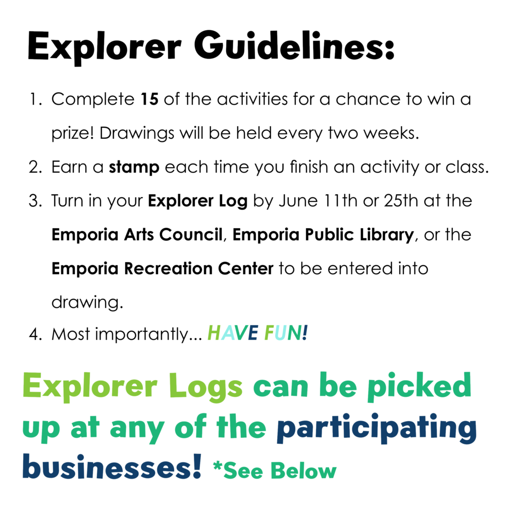 The Emporia Arts Council is excited to present a new program, the Emporia Summer Explorer Log. This program is a partnership between EAC and local businesses and organizations providing information on fun activities for kids in Emporia and surrounding communities to enjoy this Summer!