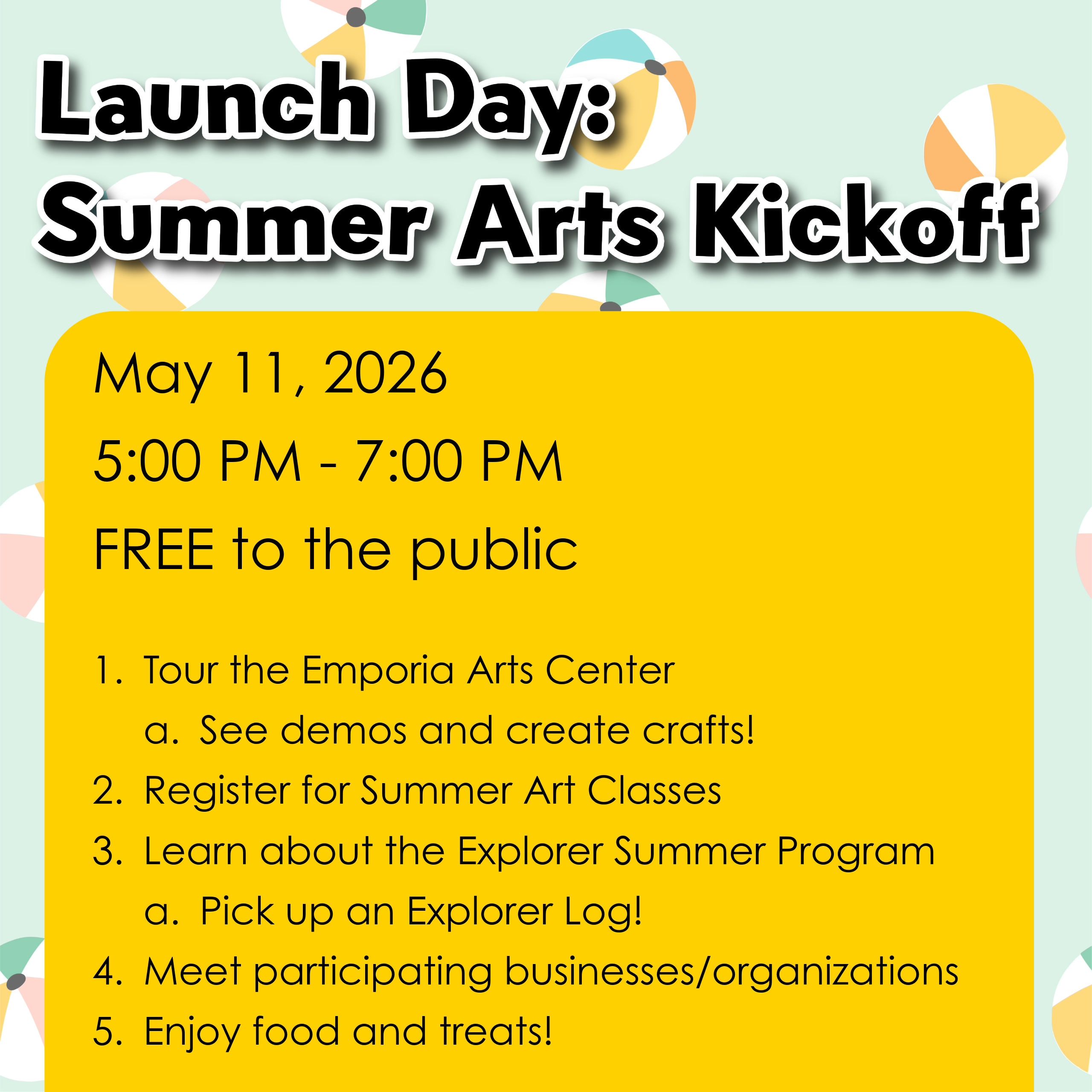 The Emporia Summer Explorers is a collaborative, community-wide initiative designed to encourage youth and families to explore arts, culture, and enrichment opportunities throughout the summer months. By partnering with local organizations, businesses, and cultural institutions, the program fosters creative engagement, increases access to the arts, and strengthens connections between families and community resources.